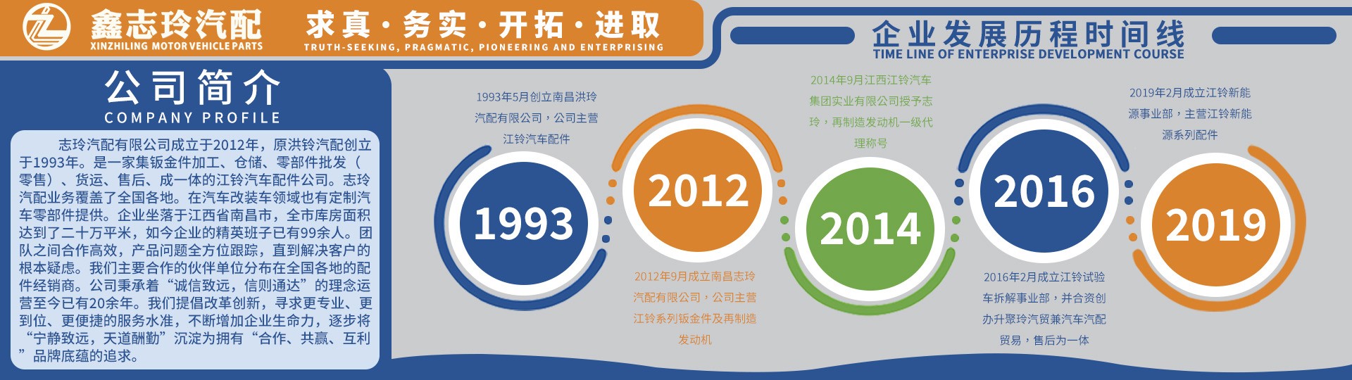 公司組成的“鑫志玲汽配”,業務包括江鈴汽車零部件及覆蓋件、銷售、物流、售后、鈑金件定制等,涉及江鈴的車型有、全順、特順、途睿歐、v362、v348、域虎3~9、寶典、領界、撼路者、D-MAX、鈴拓、mu-x牧游俠、瑞邁、易致新能源系列、馭勝、騏鈴、陸風、輕卡凱運、順達汽車等30多款車型,整體年度營業規模超1.5億元。 南昌志玲汽配將繼續堅持誠信、修行、務實、進取的精神發展方針,做到更專業汽車配件,為客戶排憂解難。形成經營專業化、發展規范化、模式標準化的企業平臺。力爭成為世界知名企業的首選供應商。南昌志玲汽配將繼續堅持誠信、合作、務實、進取的共贏發展方針,形成產業多元化、發展規?;?、經營專業化的產銷經營格局。
